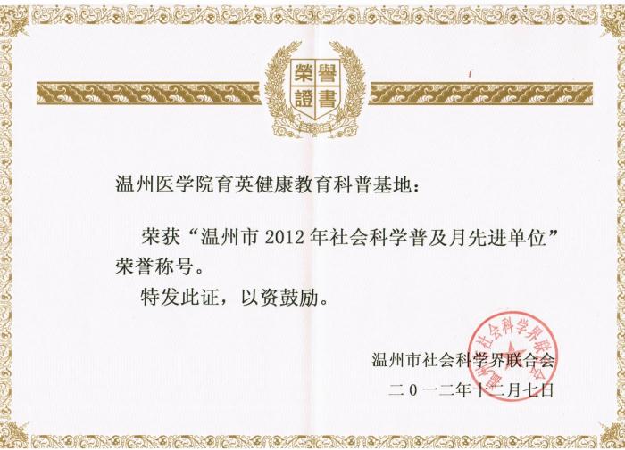 近日,我院育英健康教育科普基地被市社会科学界联合会授予“温州市2012年社会科学普及月先进单位”荣誉称号,这是对我院科普工作的认可与鼓舞。 我院育英健康教育科普基地成立于2010年9月,是“浙江省第三批社会科学普…