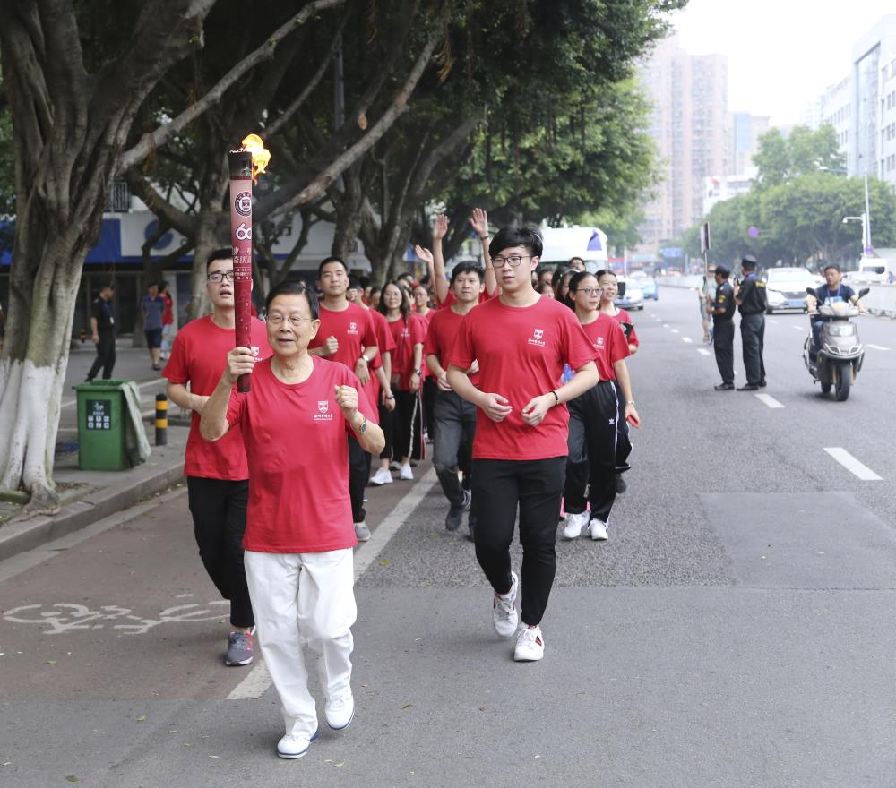 83岁的谢了武老师作为第三棒接力手,阔步向前、步伐有力,展现了白发长者敢于争先的勇气。