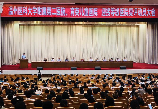为认真贯彻落实浙江省卫计委新一轮医院评审工作的部署和要求,确保三甲复审工作的顺利进行,6月13日下午,我院在人民大会堂隆重召开了“三甲”等级医院复评动员大会,院领导、各职能中层干部、科主任、护士长、科助理、亚专科负责人、中级及以上职称人员,近千人与会。会议特地邀请了温州医科大学李校堃校长、浙江省医疗质量控制与评价办公室专家作专题讲座。沈贤副院长主持。