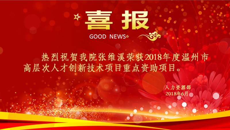 【喜讯】热烈祝贺我院张维溪荣获2018年度温州市高层次人才创新技术项目重点资助项目
