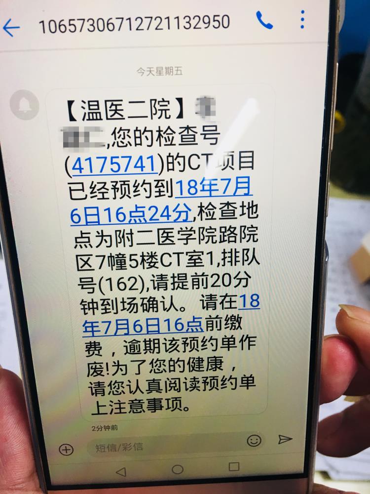 在预约成功后,患者会收到确认短信,告知下次就诊时间、取号方式、就诊号或者特检预约相关信息等。就诊卡已绑定手机的患者,其相关费用可以自动扣除,方便快捷、省时省力;就诊卡未绑定手机的患者,可通过扫描预约单上的二维码进行支付,也支持自助机、缴费窗口缴费。