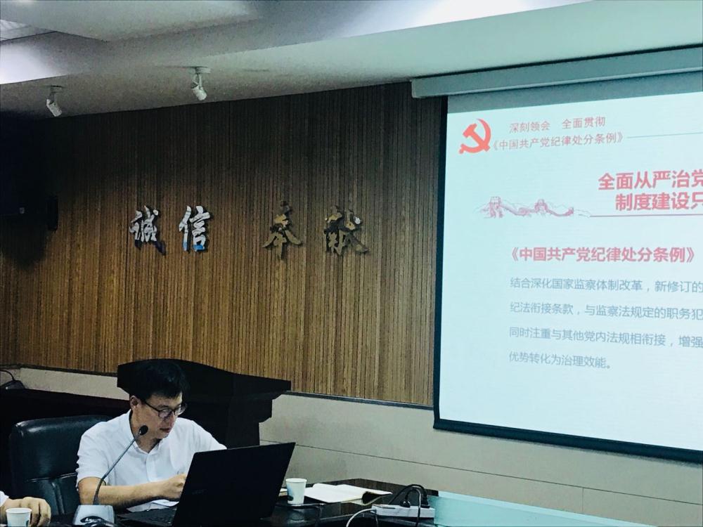 纪委吴连拼书记对《条例》进行了深入的解读。指出,新修订的《条例》是全面贯彻习近平新时代中国特色社会主义思想和党的十九大精神的重要保证,是加强全面从严治党和党风廉政建设的重要举措。各党支部要全面学习领会新修订的《条例》精神,坚定理想信念。他提出五点要求:1.强本固基,加强党的领导,贯彻好中央八项规定精神;2.聚焦主体责任,各位切切实实把自己摆进去,抓好各种制度建设;3.聚焦群众满意,需要阳光,公开公示;4.建立责任体系,抓关键岗位、关键节点;5. 专项治理红包、回扣事项。与会人员结合修订前后对照表,从修改背景、修改亮点、修订意义、修订内容、修订背后的故事这五大方面详细了解和学习了《条例》产生的时代背景和全部内容。