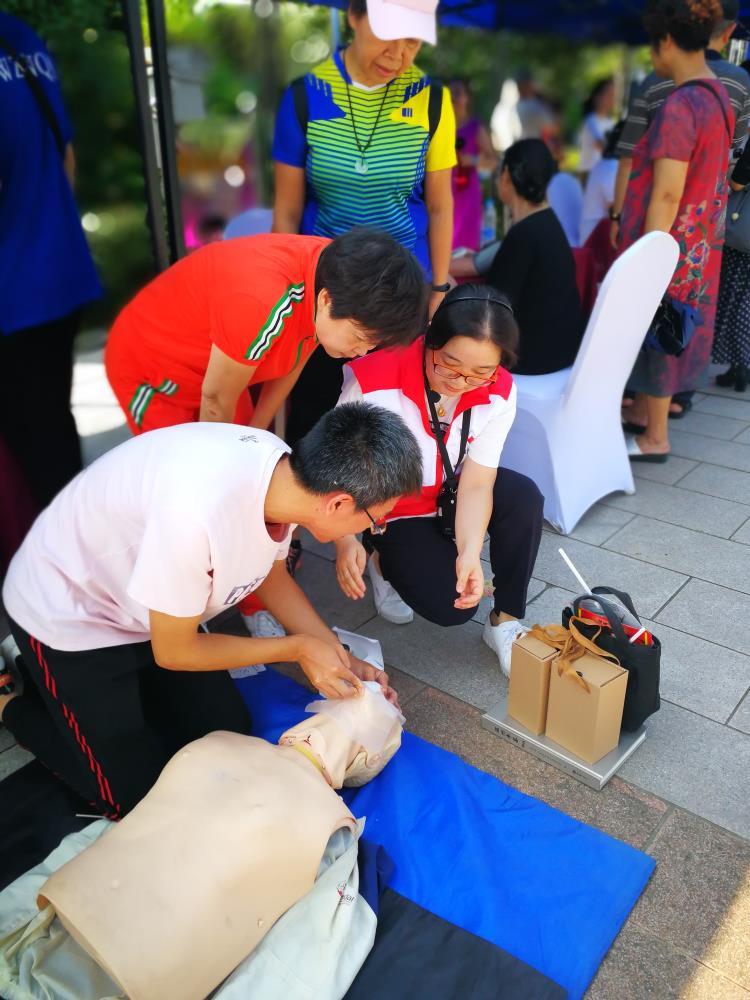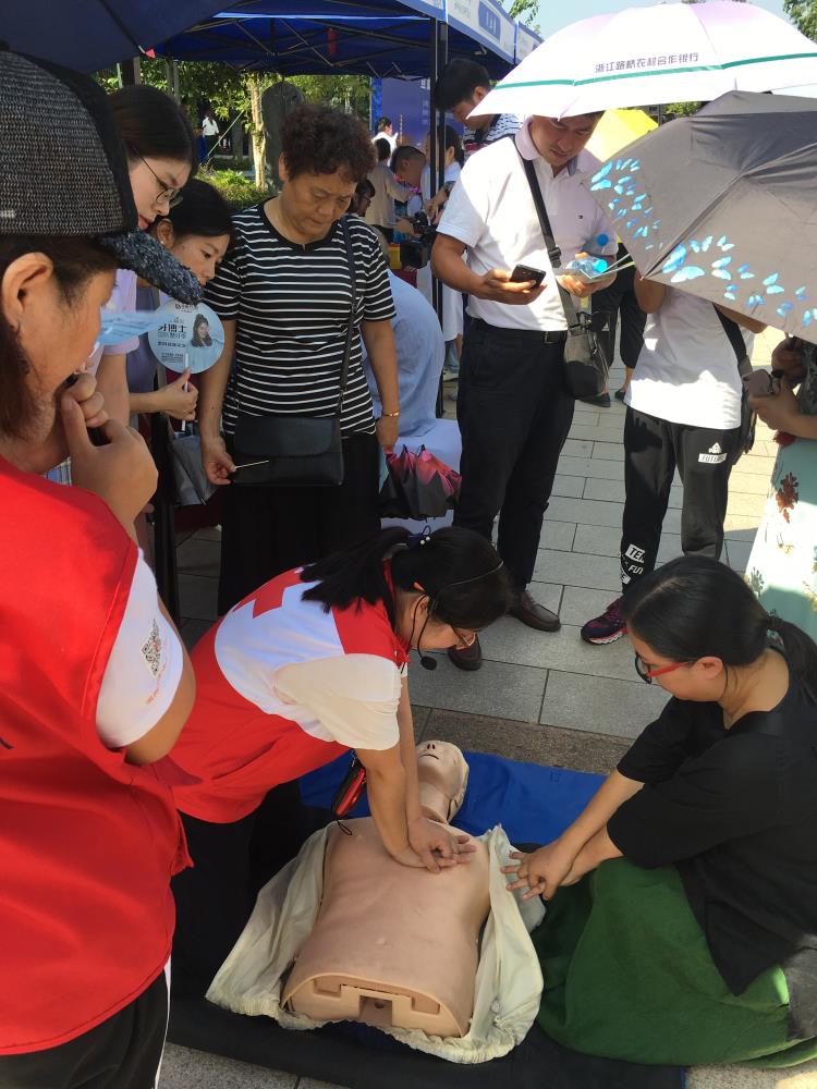 本次现场教学活动主要内容包括心脏按压、人工呼吸、便携式除颤仪AED的使用等。救护师许国娟在现场对于市民进行了科普教学和模拟操作,特别是关于心脏按压的动作要领,便携式除颤仪AED的具体使用等等。