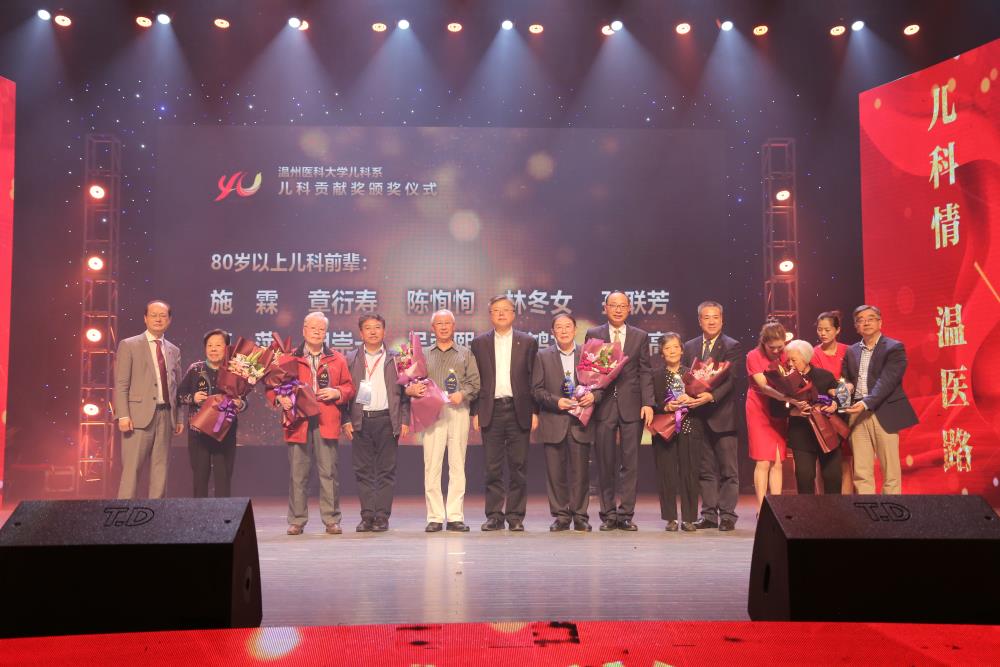 同时,值此儿科系成立四十周年之际,晚会特别设立了儿科贡献奖,对温医大儿科系做出巨大贡献的前辈们表示感谢,贡献奖获得者分别为80岁以上高龄和从医执教逾50年的儿科前辈。李校堃校长等晚会嘉宾、儿科系友亲自为获奖者颁奖。