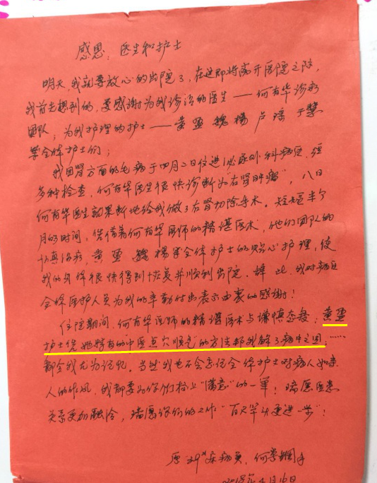 原来,写这封感谢信的患者何大爷今年70岁了,4月份入住我院泌尿外科病区,经诊断为“右肾肿瘤”。何有华主任团队为其做了“腹腔镜右肾Ca根治术”,手术顺利。但术后第二天早晨,何大爷开始感觉腹胀,下床活动后肛门仍未排气。当晚的值班护士黄盈在巡房时发现何大爷辗转反侧、难以入睡。细心的她为何大爷做体格检查时发现其腹胀明显,于是就帮何大爷轻轻地按摩中脘穴,效果显著,何大爷很快就排气了,腹胀明显缓解,再巡房时,何大爷已安然入睡。