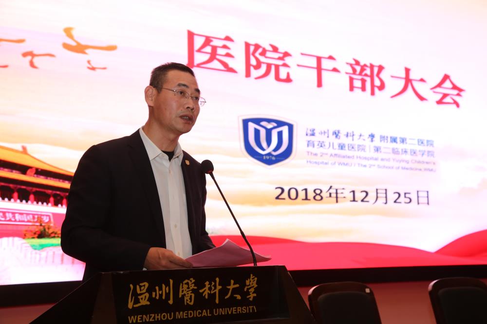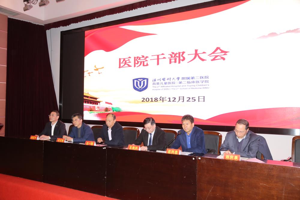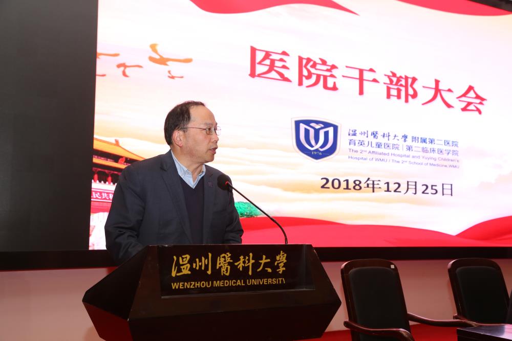 12月25日下午,我院在温医大学院路院区学术报告厅召开医院干部大会。温州医科大学党委副书记吕一军,党委委员、副校长王良兴,纪委书记吕文革,党委委员、组织部部长庄兴忠出席大会,我院党政领导班子全体成员、中层干部、业务骨干、党支部书记、民主党派代表,校党代会代表、教代会代表,各级人大代表、政协委员等300余人参加大会。