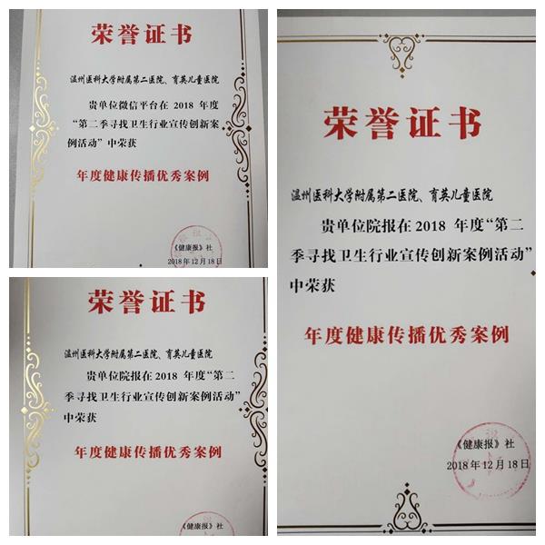 同时,年会对2018年优秀宣传工作者及品牌优秀宣传案例等进行表彰,我院宣传工作再次受到肯定,党委副书记许慧清荣获年度健康传播优秀宣传工作者,我院还分别荣获微信平台类、院报院刊类年度健康传播优秀案例,年度品牌活动优秀案例等,共四项大奖。