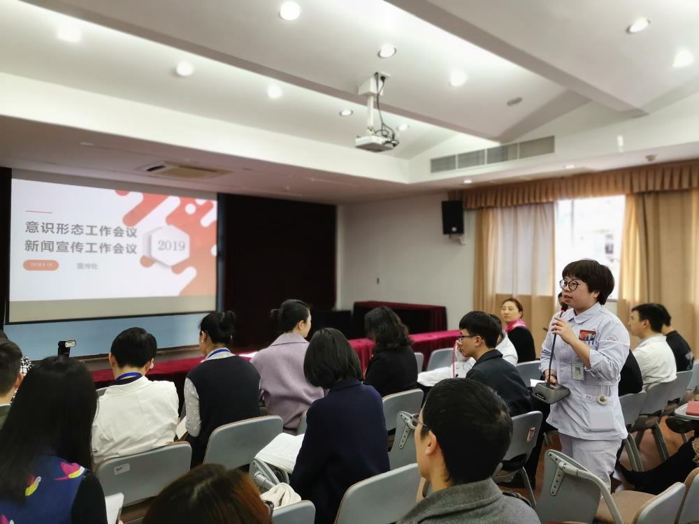 另外,许慧清副书记在会议上就2019年的宣传重点进行了部署。她提出以下几点要求:(1)专心做好意识形态工作,把握思想政治高度,及时应对舆情。加强对科室墙面、宣传橱窗、电子显示屏、微信公众号等意识形态阵地的管理;加强对科室微信公众号、网站科室专栏等互联网平台的管理;重点管好具有新闻舆论和社会动员功能的新媒体,规范网上信息传播秩序,严密防范网上意识形态渗透;(2)把加大名医名科名院宣传作为我院宣传的重点,并对特色专科技术进行全面推广;(3)重视瓯江口院区、龙湾院区的前期宣传工作;(4)继续做好节日文化宣传,弘扬正能量;(5)创新宣传形式,如动漫、抖音等;(6)和新闻媒体深度合作,提高宣传的专业性、针对性。许慧清副书记希望每一名职工都重视宣传,不断创新宣传手段,拓展宣传平台,同时继续加强宣传队伍建设,促进宣传水平再上新台阶。