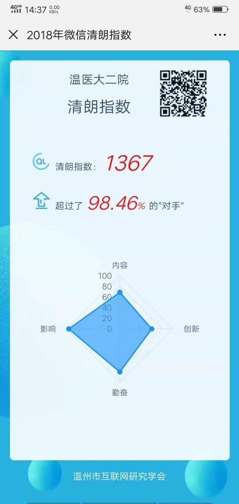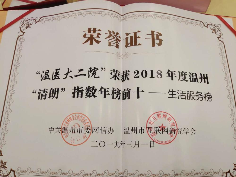 “温医大二院”微信号以位列生活服务榜第二名的好成绩,获评生活服务榜单“清朗”指数年度“清朗运营奖”殊荣。
