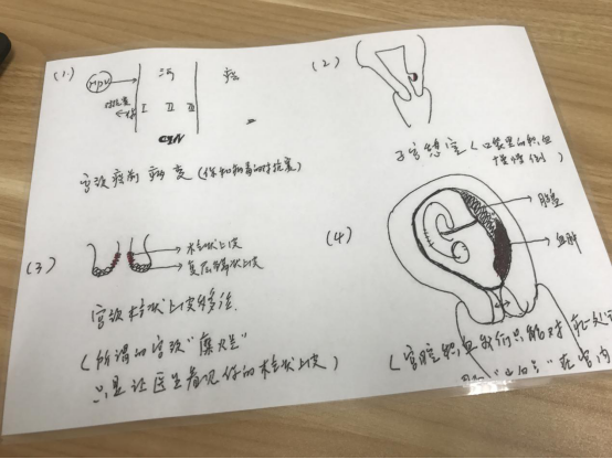 医生在诊疗时总会有些各自的小小习惯,陈文兵也不例外。每当向患者解释专业术语时,陈文兵总会拿出几张卡纸,上面是一些妇产科常见疾病的手绘解剖图,比如宫颈癌前病变、子宫憩室等。