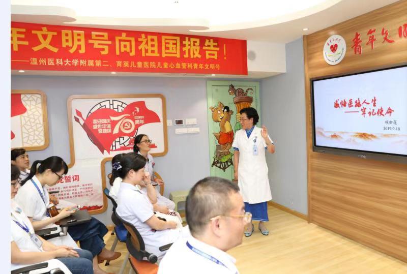 本次活动的主讲人为项如莲教授,曾任温州医学院附属儿童医院主任,心血管科带头人,项主任一直以赤诚的医者情怀和纯粹的人格魅力潜移默化的影响着一代又一代的儿科人。作为儿童心血管科开拓者的项奶奶与我们重温历史,讲述50年来的艰苦求学之路与科室创建过程中面对的重重难关,并结合当前医疗环境赠予青年医者四句箴言:“敬佑生命,救死扶伤;甘于奉献,大爱无疆”,勉励医者牢记使命,托起生命的重任,不管是面对工作中的困难还是外界的质疑,都应当不忘初心,矢志不渝的为患者带去疗愈与慰藉。这也正印证了儿童心血管青年文明号的服务理念,自2005年创立以来,始终以“守护健康,呵护心灵”为口号,以“CARE”为核心,致力于打造思想积极向上,医疗服务一流的青年团队,为患者提供优质的就医平台。此次青年文明号开放周活动旨在激励青年医务工作者要敢于有梦、勇于追梦、勤于圆梦,在自己的岗位上建功立业,向新中国成立70周年献礼!