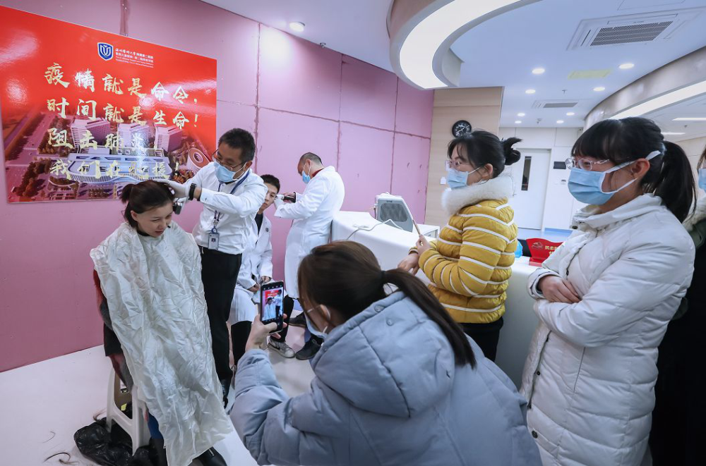 龙湾院区建设综合办公室主任、心胸外科医生杜杰临时充当了“美发师”。杜主任平时拿手术刀的手,如今拿起电推剪利落一推,专用发型就这么统一“批发”出来了。