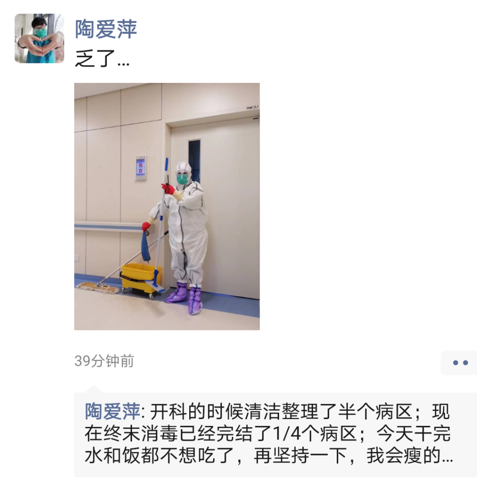 护士戴一希很想念西式快餐的味道。“我们在病区吃得很好,食堂的厨师张师傅特别照顾我们,会根据我们的需要,配搭不同的菜式。在‘二月二’的时候,还特意给我们炒了芥菜饭。”她随即笑着说,“但我现在想吃垃圾食品,想吃零食。”2月28日,戴一希在朋友圈“抱怨”老公:都送笔记本电脑过来了,怎么不顺便投喂点吃的?各种零食不香吗?