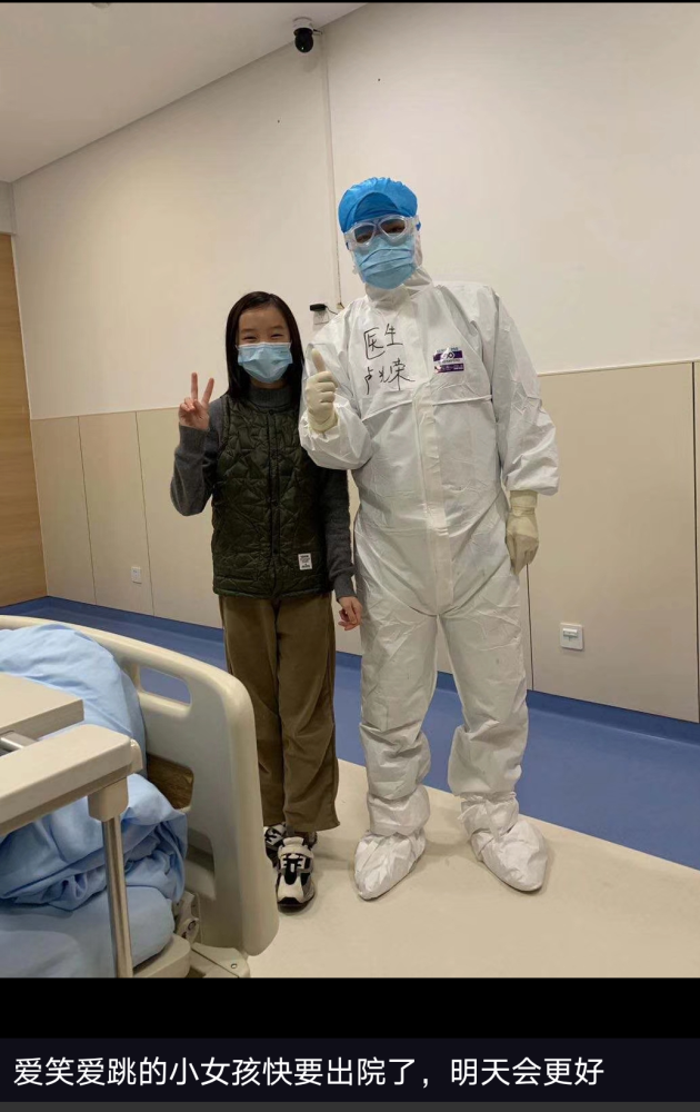 病区中最小的确诊患者,是一名9岁女孩。给大家留下深刻印象的是,这名小女孩爱唱爱跳,非常开朗。“许多大人确诊之后愁眉苦脸的,但这小姑娘不一样,很爱笑,虽然戴着口罩,但眼睛经常笑得眯成一条缝。”邢大伟说。