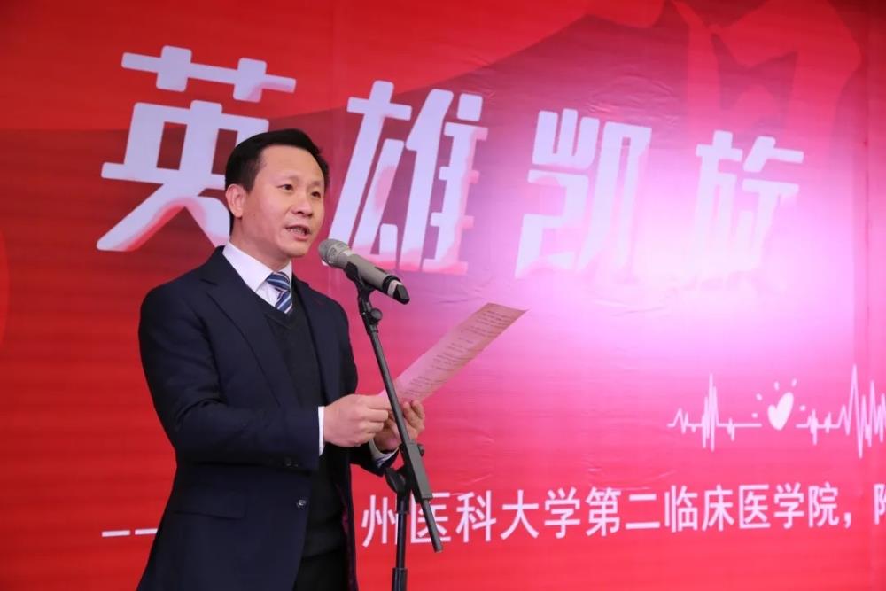 医院党委书记褚茂平代表医院党委、院领导班子和全院职工向援鄂医疗队的凯旋表示最热烈的欢迎和最崇高的敬意!