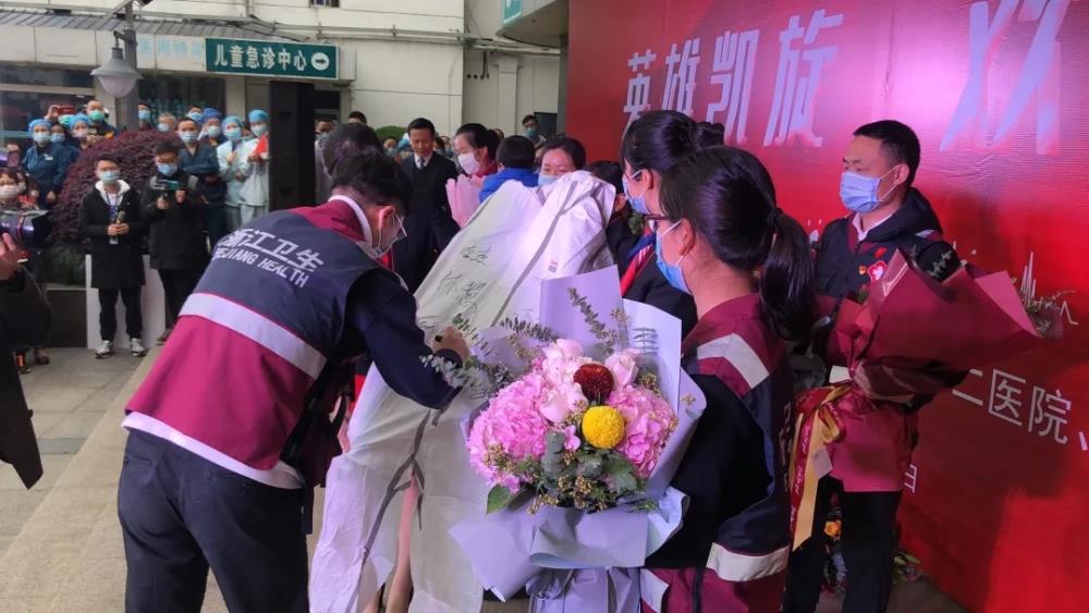 7名援鄂人员手捧鲜花