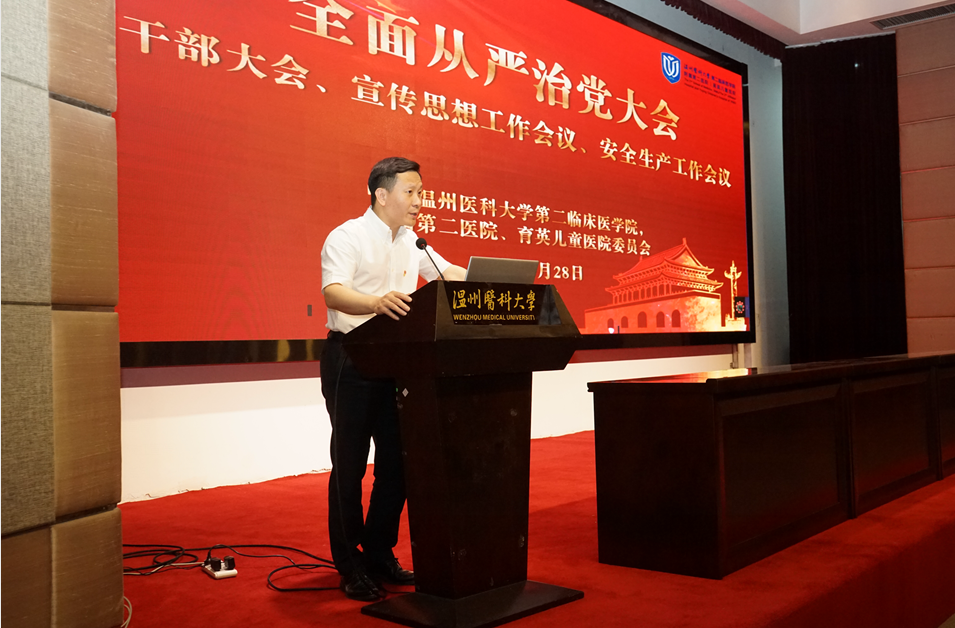 5月28日下午,我院在温医大学院路院区学术报告厅召开全面从严治党大会。全体领导班子,新任命的职能中层干部,各学科(系)、科室主任,党支部书记等近300余人参加。除了主会场,此次会议还分设了南浦院区、瓯江口院区、龙湾院区和台州院区分会场。会议由院党委副书记、院长沈贤主持。
