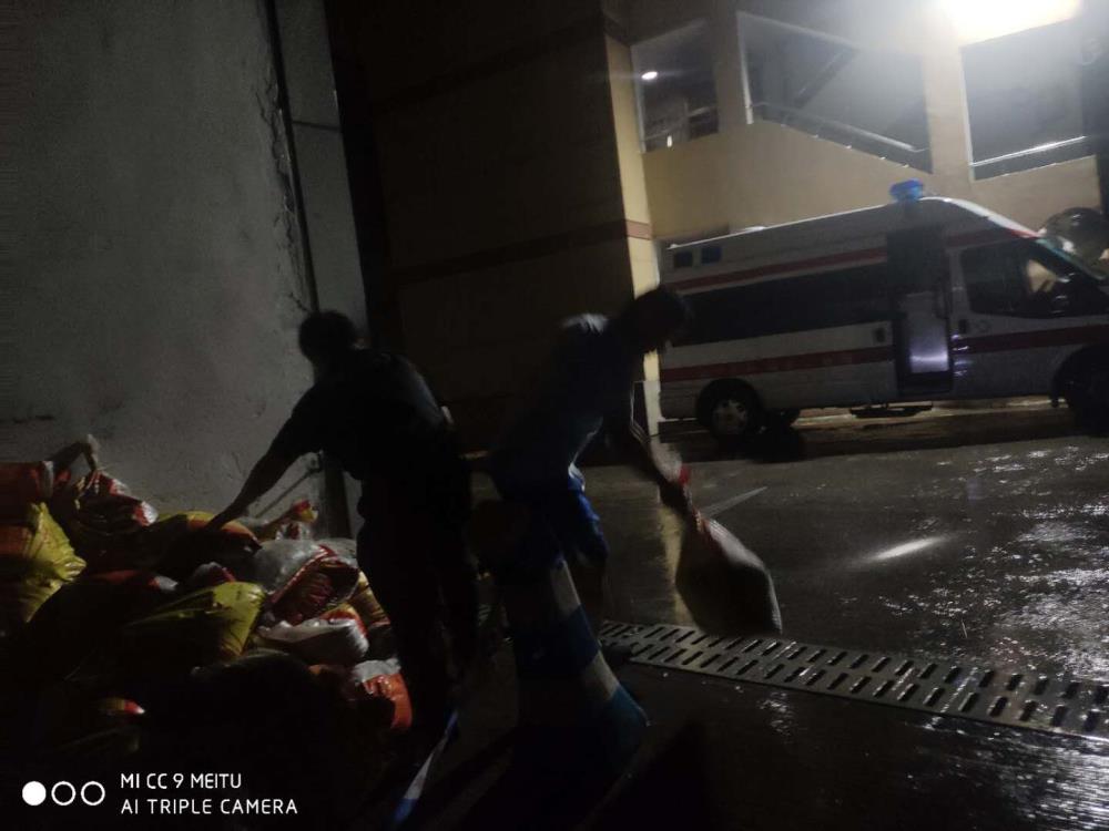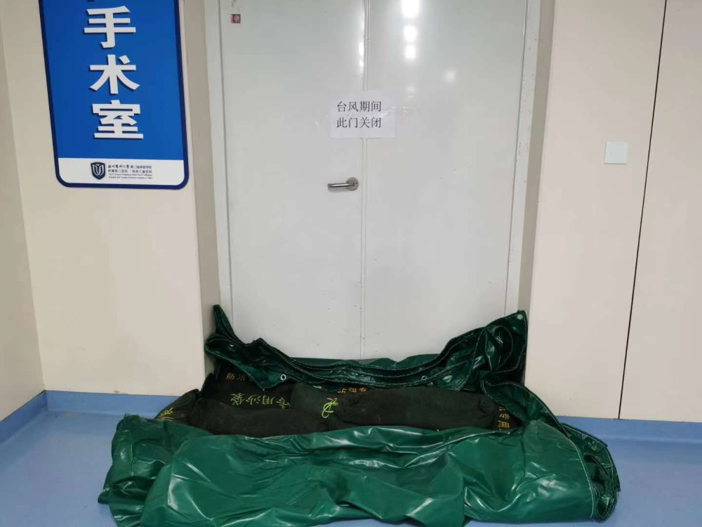 据吴连拼副院长介绍,后勤保障处为该院区提前储存了40吨饮用水、2天的食品储备、5台抽水机、1吨用于发电的柴油、数百只防汛沙袋,同时对主发电机进行提前调试,确保紧急情况下的良好运行。他指挥有关部门,首先将低洼处的人员转移至高处集中管理,统一关闭迎风面的窗户,在各出入门户进行横杠加固,在容易出现倒灌的坡道、连廊用沙袋防护。