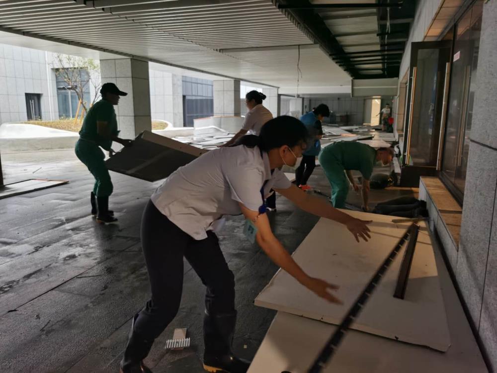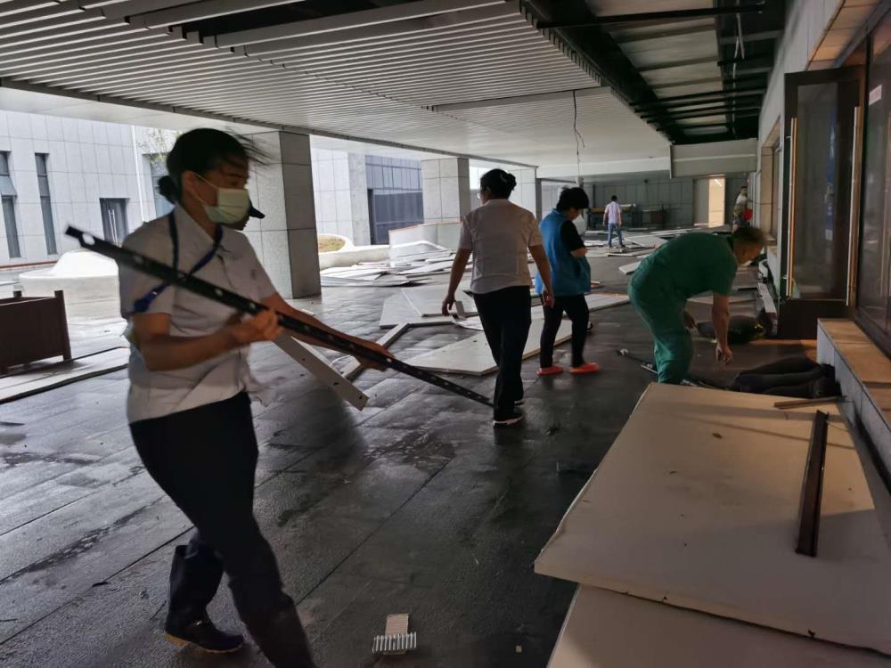 龙湾院区由王向阳副院长坐镇指挥。昨天,在他牵头下,首先将100多名建筑工人集中到安全处统一管理。同时,指示后勤部门对玻璃幕墙、行政办公室出现的局部渗水情况进行处理,对院区重要用电设施的积水及时进行排除。