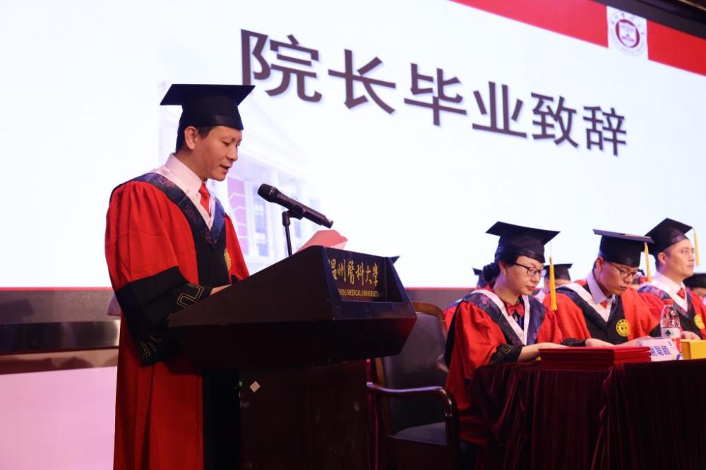 仪式在庄严的国歌声中拉开帷幕。沈贤院长首先对2020届毕业生所取得的成绩给予充分的肯定:在座的同学中,有一批向上向善、勤学善思的优秀青年,有在疫情中坚守临床一线的研究生志愿者;有获国家奖学金特别奖、团中央践行社会主义核心价值观先进个人等国家级个人荣誉20余项,浙江省十佳大学生、浙江省优秀毕业生等省级个人荣誉60余项。这些成绩的取得源于同学们的艰苦奋斗与顽强拼搏,学院为你们感到自豪和骄傲。同时沈院长也对同学们提出了几点希冀,希望同学们毕业之后可以坚守理想信念之灯,练就一身“扎实、过硬的本领”,成为可堪大用、能担重任的栋梁之材;心系母校,心系学院,继续关心、支持学校、学院的发展。