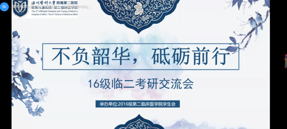 9月4日与9月5日晚,温州医科大学第二临床学院举办以“不负韶华,砥砺前行”为主题的2016级考研交流会。由于疫情和实习等原因,考研交流会以钉钉线上直播形式进行,一共分两场,一场是针对临床专业的同学,另一场是针对麻醉、中医、康复、儿科专业的同学。年级特邀目前就读于北京大学、复旦大学、上海交通大学、温州医科大学等知名高校的11位临二优秀毕业生为300多名16级考研学子解答考研路上的困惑。