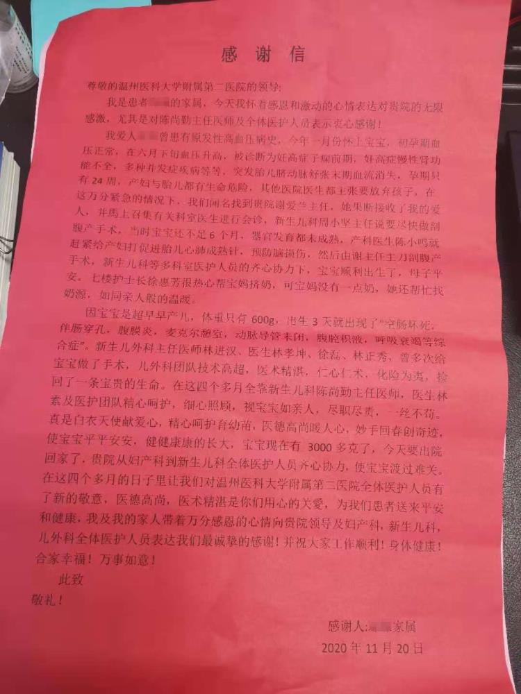 常言道,“十月怀胎,一朝分娩。”潘宝宝却因为种种原因不得不提前来到这个世界。他的母亲是温州本地人,在出国留学时突然身患重疾,经过救治后落下一堆后遗症,妊娠期间面临“慢性高血压并发子痫前期、脐血流异常、妊娠合并慢性肾病、妊娠合并肾功能不全、妊娠合并大动脉炎可能、脑出血个人史、妊娠合并轻度贫血、高龄初产妇”的多重困难下,慕名选择到我院生产,在怀孕6个多月的时候选择剖宫产,7月3日在我院南浦院区成功分娩。