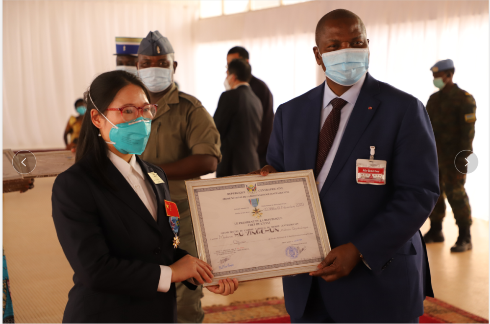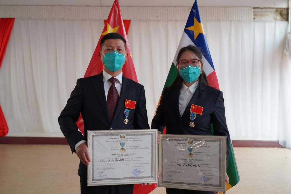 为表彰医疗队为中非人民的健康和中非医疗卫生事业发展作出的贡献,12月26日,中非总统府举行为中国援中非第17批医疗队授勋和"中国-中非命运共同体中国大使奖章"颁发仪式。中非总统图瓦德拉、中国驻中非大使陈栋、中非卫生部长索姆塞、警察总监左古埃准将,以及中国援中非第17批和第18批医疗队全体队员出席仪式。图瓦德拉总统亲自为即将结束使命回国的援中非第17批医疗队全体队员授勋,并同每名队员合影留念。