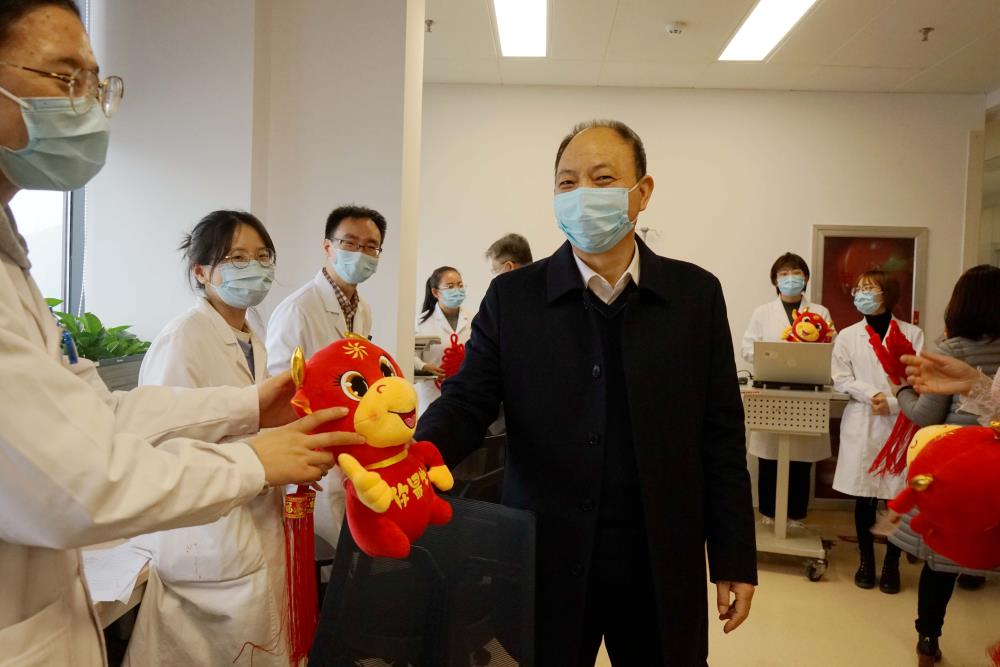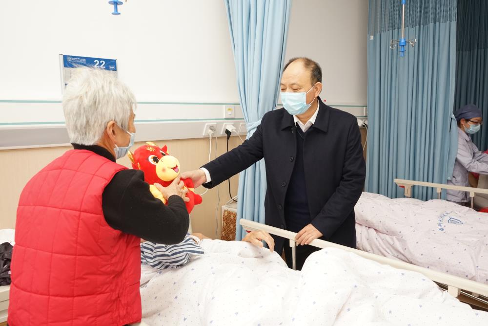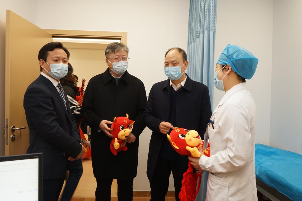 春节将至,年味渐浓。2月10日,在新春佳节来临之际,学校党委书记吕一军、校长李校堃偕校领导班子成员一行赴我院龙湾院区亲切看望慰问了我院坚守在一线临床岗位的医务人员,为他们送上节日问候和新春祝福。我院党委书记褚茂平、院长沈贤陪同慰问。