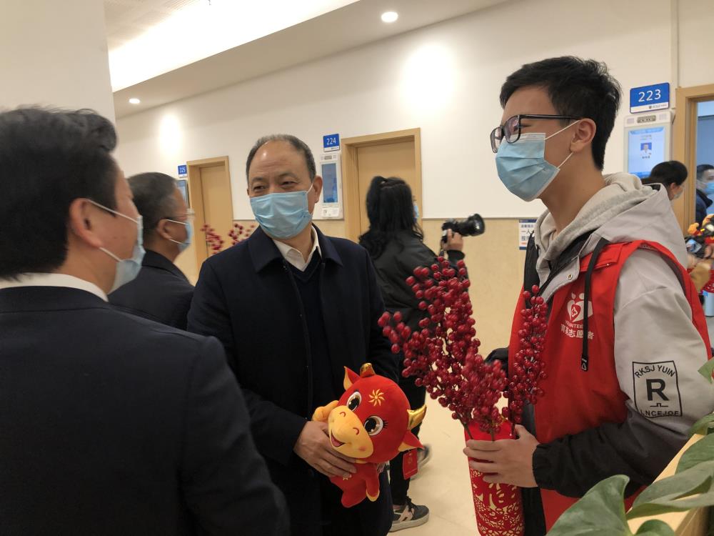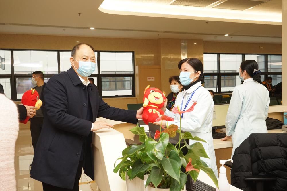 在门诊部,吕书记向一位志愿者了解其工作情况,并对志愿者的服务精神表示感谢。在门诊诊间,吕书记、李校长也向神经内科胡蓓蕾主任了解龙湾院区启用后科室的接诊情况等,并向胡主任致以新春最美好的祝福。两位领导也逐一至各诊室向门诊医生送去新春慰问。