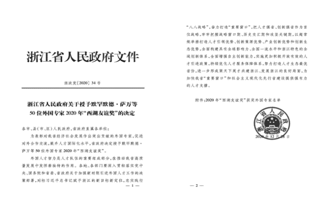 据悉,“西湖友谊奖”是浙江省人民政府为表彰外籍专家在浙江省经济建设和社会发展中所作出的突出贡献和奉献精神而设立的最高奖项,从1997年设立以来,每年评选一次。此次全省共有50位外国专家被授予此殊荣。