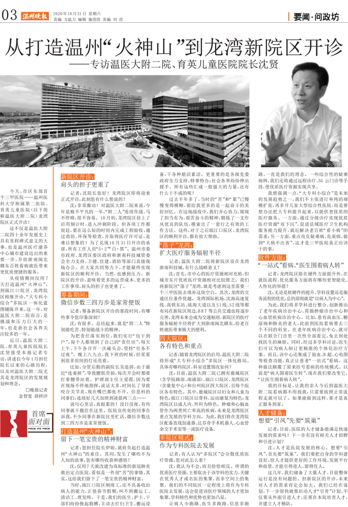 近日,温医大附二院、育英儿童医院院长沈贤接受温州晚报记者专访,讲述自今年1月担任院长以来的心路历程,以及对温医大附二院尤其是龙湾院区的发展规划和理念。