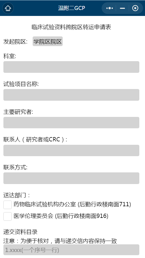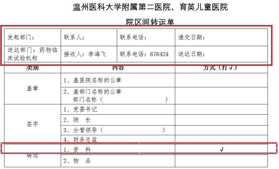 第三步:机构办收到资料后将进行审核,完成机构办、伦理签收后,按《院区转运单》中的联系人、联系电话返回资料至鹿城院区。