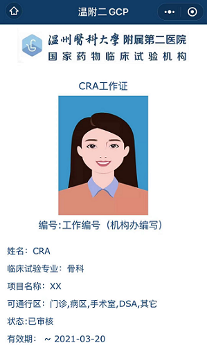 *CRC在办理证件前需完成机构办的入职考核流程,证件有效时间为12个月,次年重新申请;CRA在办理证件前需与科室研究者沟通确认可以进行监查,证件有效时间按监查时长设置,最长不超过7天。