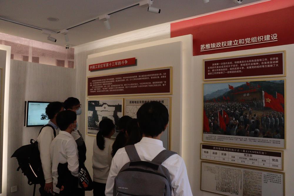 1930年6月18日至22日,“浙南一大”在仙岩渔潭村召开,来自温州、台州、金华等地的25名党代表参会。在参观学习过程中,支部成员们漫步在纪念馆的展览厅里,一幅幅图片、一件件展品、一段段介绍……诉说着浙南地区的革命先烈、先辈们为共产主义事业出生入死、浴血奋战的悲壮历程和光辉事迹。
