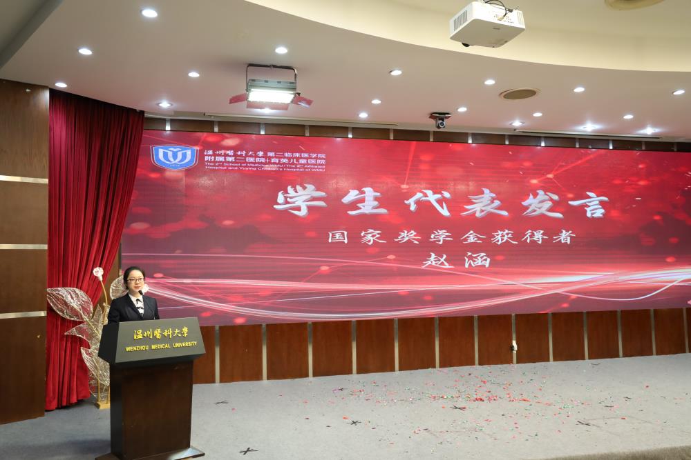 国家奖学金获得者2016级临床6班赵涵作为获奖学生代表发言,她提出了后天努力的重要性,分享了自己的座右铭——做事要知不足,做学问要不知足。