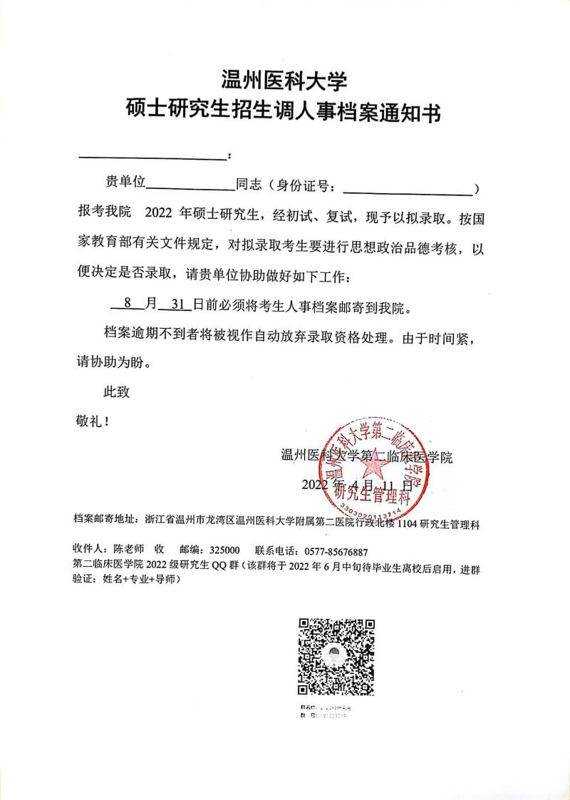 温州医科大学硕士研究生招生调人事档案通知书