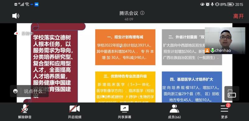 讲座通过云端视频直播及线上互动交流的方式,为广大考生和家长提供招生政策宣讲和志愿填报公益指导。陈浩处长就2022年高考招生政策、高考志愿设置及投档、高考志愿填报策略、温州医科大学情况介绍等内容,为考生及家长进行一次高考志愿填报政策的系列深度解读,并与考生及家长进行线上交流咨询。