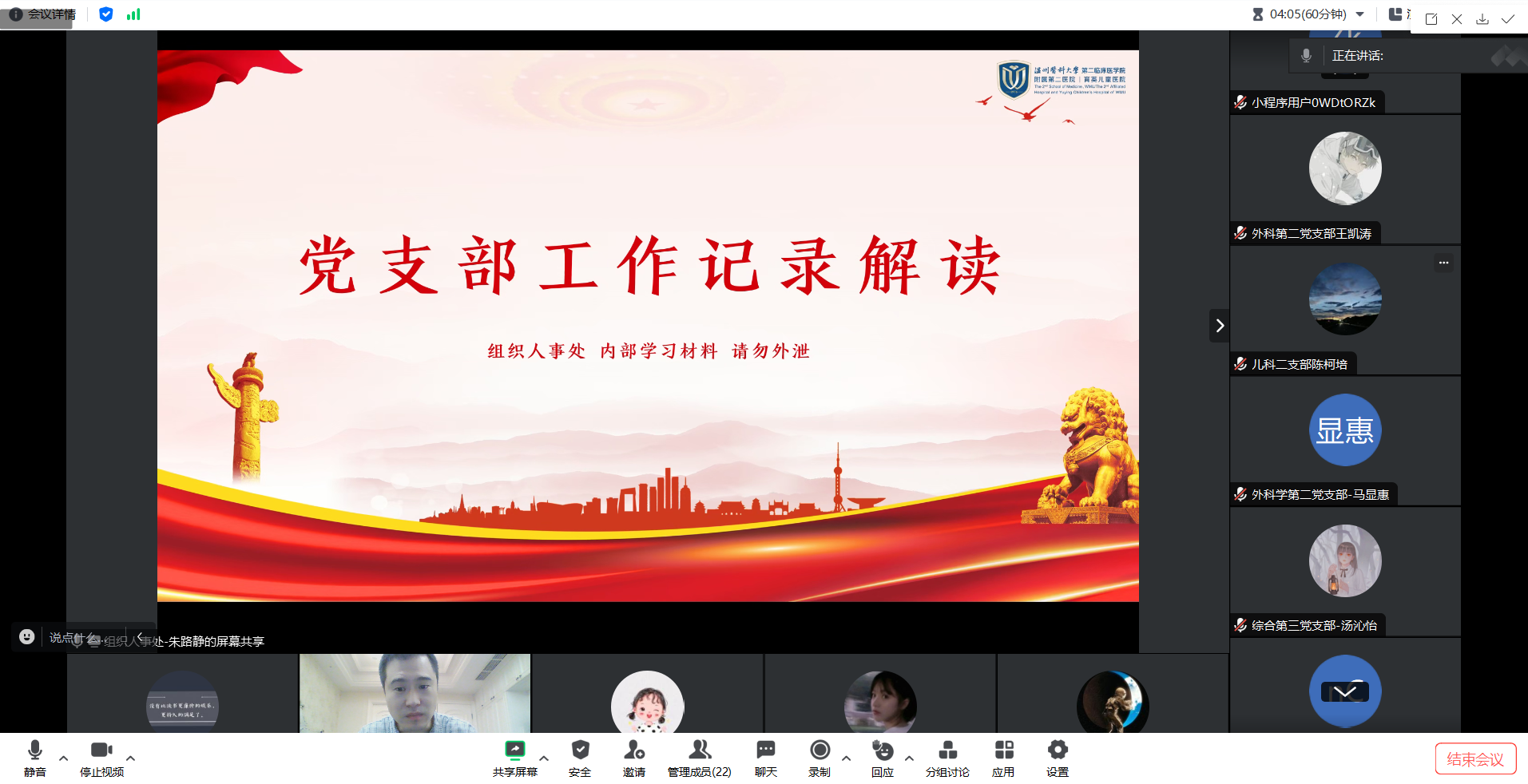 为进一步夯实研究生党支部基础工作,提高支部工作记录的规范化水平,第二临床医学院于12月27日举办了研究生支部工作手册规范记录线上培训会。本次会议由学院学生党总支组织委员、研究生管理科副科长陈孝春主持,邀请附二医组织人事处干部朱路静、金佳乐进行专题授课。参会人员包括研究生管理科全体教师、各支部书记与副书记、组织委员以及相关组长。