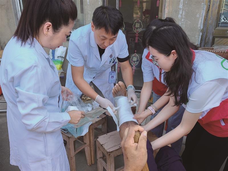 当天上午,肤生工程团队第一站来到河头镇岭合村陈阿公家。今年72岁的他左脚已经烂了20多年,只见他的左踝关节附近烂开10多厘米的口子。此前,他已经多次到杭州、台州的医院治疗,但一直没有治愈。张文振现场为陈阿公做了初步检查,认为陈阿公属于静脉性溃疡伴感染,需要多学科联合介入治疗,“不仅要治疗陈阿公的创面,还要治疗其他疾病,预防复发。”肤生工程团队给陈阿公包扎了伤口,并让家属再带阿公到医院做详细检查,如果能做手术,肤生工程将给予帮助。