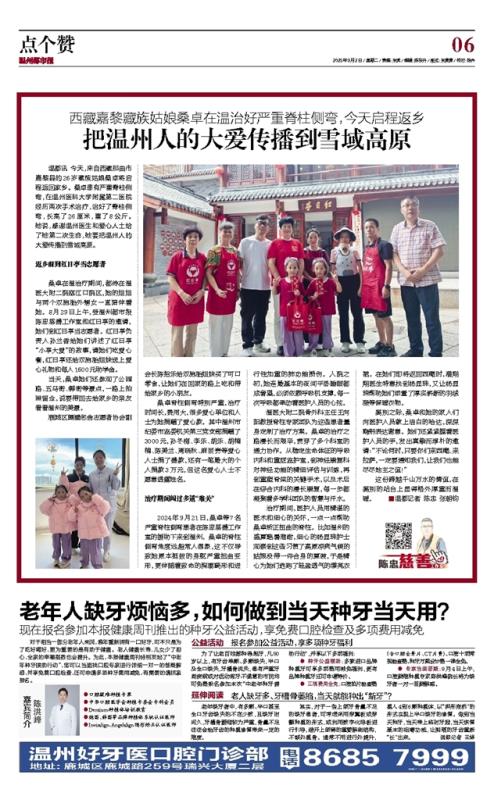 治疗期间,医护人员用精湛的医术和细心的关怀,一点一点帮助桑卓矫正扭曲的脊柱。比如温州的盛夏酷暑难耐,细心的杨显珠护士观察到这些习惯了高原凉爽气候的姑娘没带一件合身的夏装,于是精心为她们选购了轻盈透气的漂亮衣裙。在她们即将返回西藏时,潘翔翔医生特意找到杨显珠,又让杨显珠帮助她们添置了厚实崭新的羽绒服等保暖衣物。