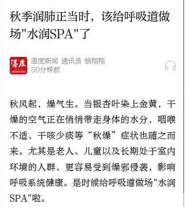 秋风起,燥气生。当银杏叶染上金黄,干燥的空气正在悄悄带走身体的水分,咽喉不适、干咳少痰等“秋燥”症状也随之而来。尤其是老人、儿童以及长期处于室内环境的人群,更容易受到燥邪侵袭,影响呼吸系统健康。是时候给呼吸道做场"水润SPA"啦。