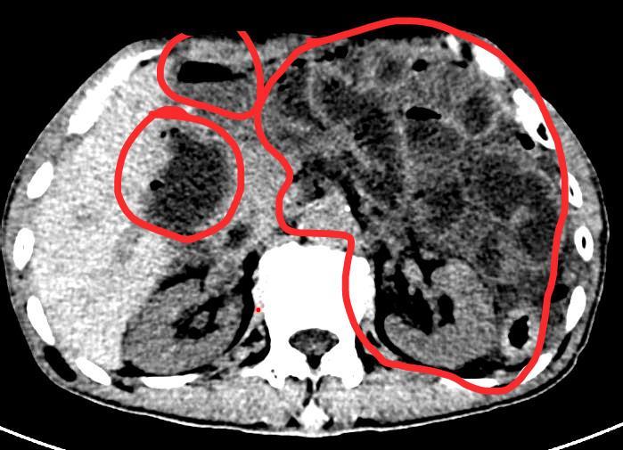 因为实在太疼,宋先生随后前往温州医科大学附属第二医院急诊科就诊。经医院检查CT显示,宋先生乙状结肠壁穿孔及气体影渗出,腹部肠腔内容物潴留。经过积极的术前准备,医生果断紧急剖腹探查,发现宋先生直肠乙状结肠下段对系膜缘见一直径约4cm的破口,同时由于他就诊不及时,导致整个腹腔内充满大量粪便,肠管、肠系膜及大网膜等多处已形成黄色脓苔,生命危在旦夕。