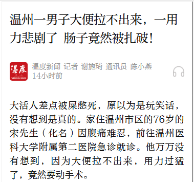 大活人差点被屎憋死,原以为是玩笑话,没有想到是真的。家住温州市区的76岁的宋先生(化名)因腹痛难忍,前往温州医科大学附属第二医院急诊就诊。他万万没有想到,因为大便拉不出来,用力过猛了,竟然要动手术。