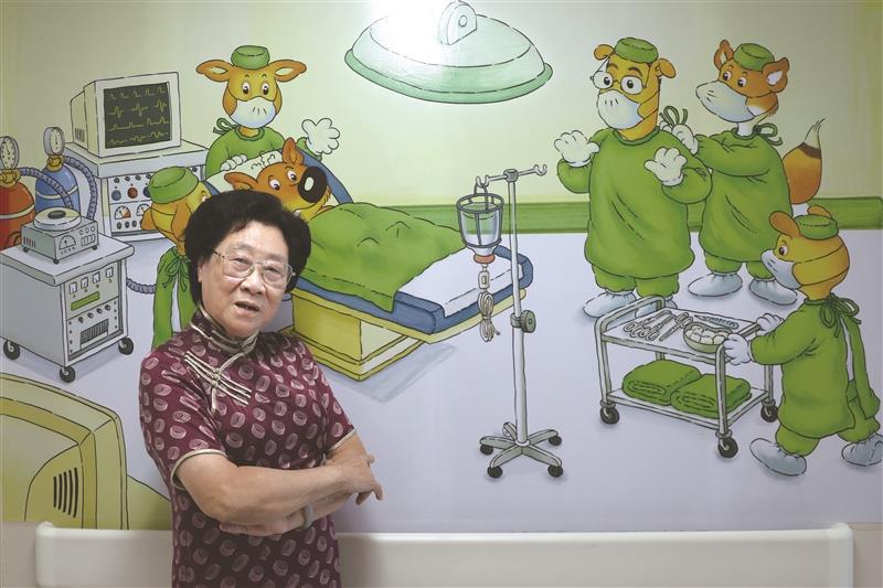 儿童心血管科病区,项如莲教授在充满童趣的漫画墙前留影。