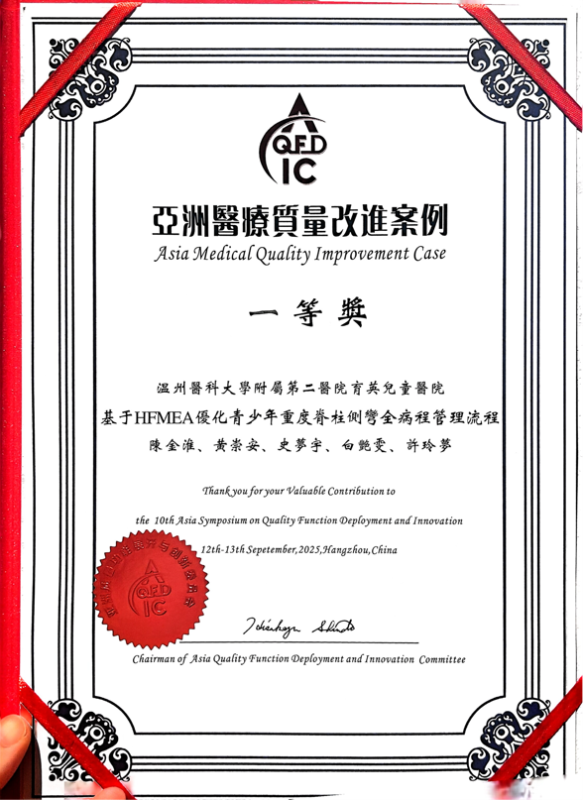 斩获此次荣誉不仅展现了我院在医疗质量改进与创新领域的卓越实力,也是对我院整体医疗水平和科研能力的高度肯定和认可。在今后的工作中,我院将继续秉承“以患者为中心”的理念,持续深耕青少年脊柱健康领域,不断探索和创新先进的医疗技术和服务模式,推动医疗质量的持续提升,为青少年脊柱侧弯患者提供更加优质、高效、安全的医疗服务。