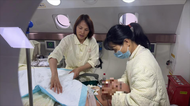 面对这样一位年轻的生命,温医大附二院高压氧科迅速组织治疗与风险评估并制定了个体化治疗方案。为确保治疗安全,尤其在患者前期病情尚不稳定的情况下,科室特别安排高压氧治疗时由护士全程陪舱,带着紧急抢救药物(如降压药物乌拉地尔针)入仓,密切监测患者生命体征,提供专业照护与心理支持,为后续治疗的顺利开展奠定了坚实基础。