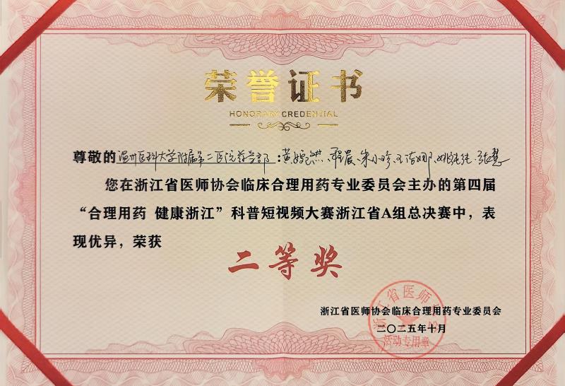 在刚刚落幕的2025年浙江省第四届“合理用药,健康浙江”短视频科普大赛中,我院药学部黄婉然、程晨、朱小珍、王洁娜、姚纯纯、张慧团队表现出色,经过激烈角逐,从全省285家参赛机构、466个参赛作品中脱颖而出,成功晋级全省A组前30强,荣获浙江省总决赛二等奖的优异成绩!