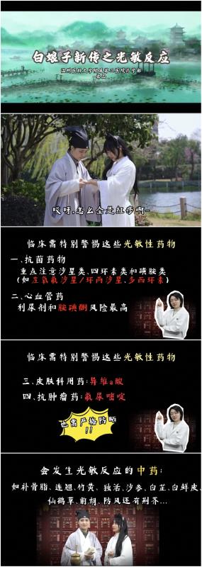 9月17日,我院药学部黄婉然、程晨、朱小珍、王洁娜、姚纯纯、张慧药师共同创作科普作品《白娘子新传之光敏反应》,从药物的不良反应——光敏反应着手,通过风趣幽默的方式为大众讲解了左氧氟沙星等药品服用后,需要注意避免紫外线的照射,以减少光敏反应的发生的用药科普。