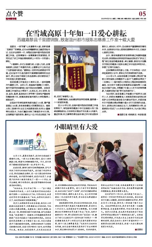 与此同时,陈忠慈善工作室着力于培养本土医疗人才,积极协调嘉黎县人民医院的医生索朗扎西和护士巴学荣赴温进修白内障治疗技术,并联系温州太平慈善功德会捐赠价值80多万元的眼科设备。如今,索朗扎西已能独立主刀,如同燎原的火种,在高原家乡完成了100多例白内障手术,为乡亲们带去光明。