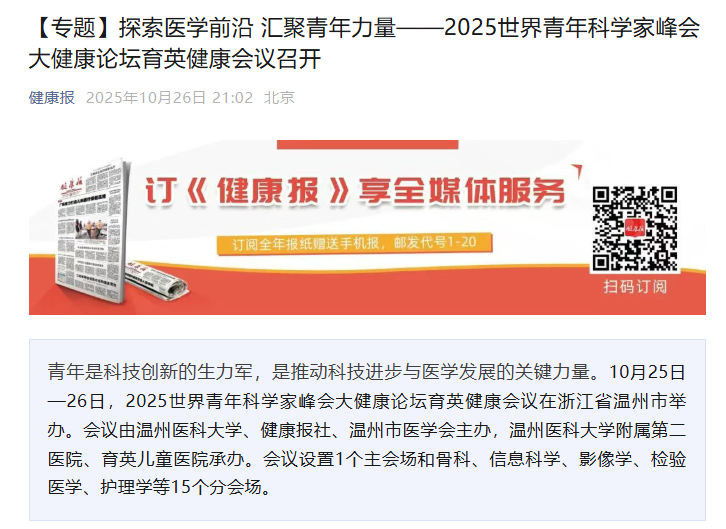 据悉,世界青年科学家峰会由中国科协、浙江省政府联合发起并共同主办,自2019年始已连续举办六届,是我国民间科技外交的重要平台之一。此次召开的2025世界青年科学家峰会大健康论坛育英健康会议是该峰会的组成部分,旨在为医学领域的青年科学家搭建学术交流平台。